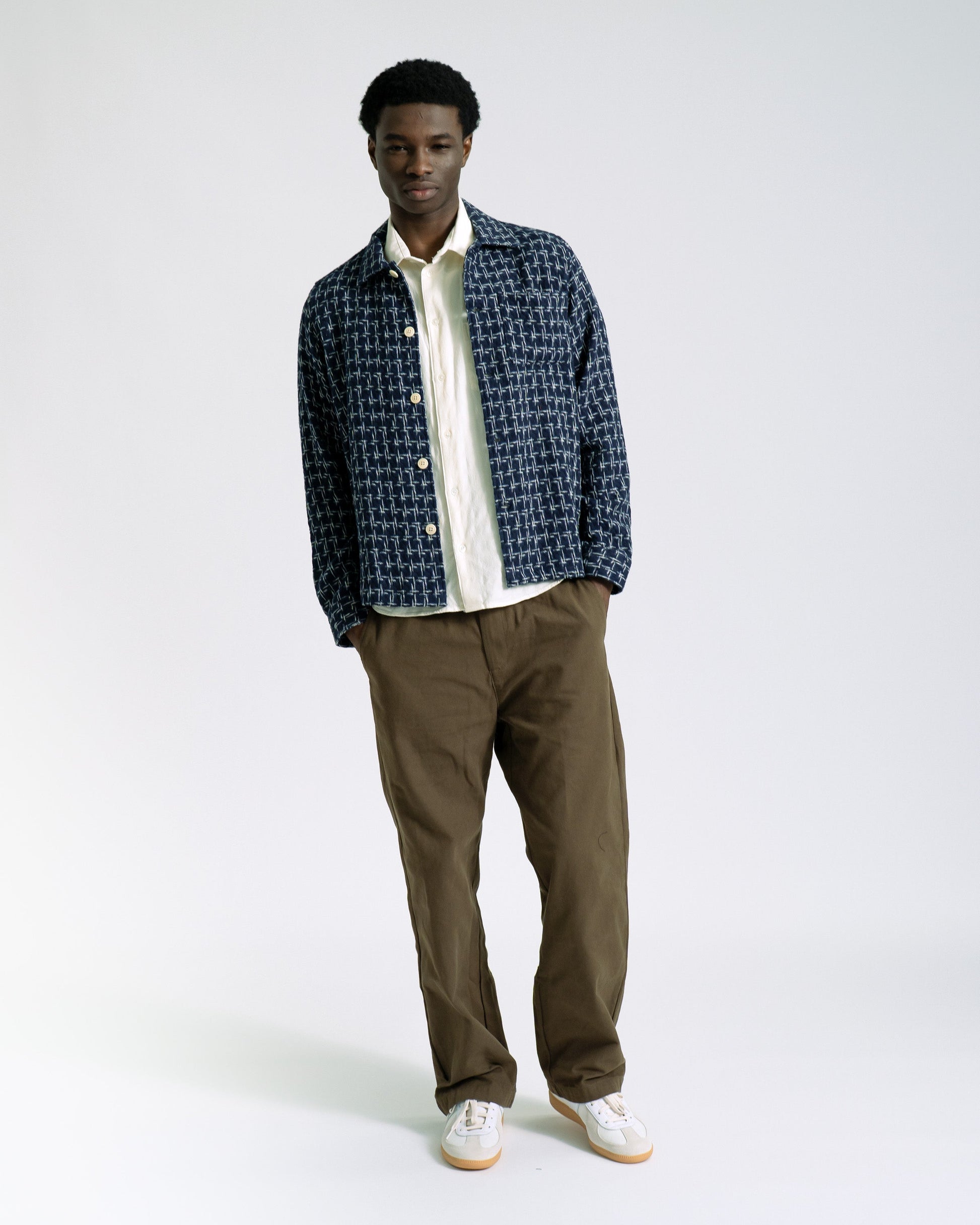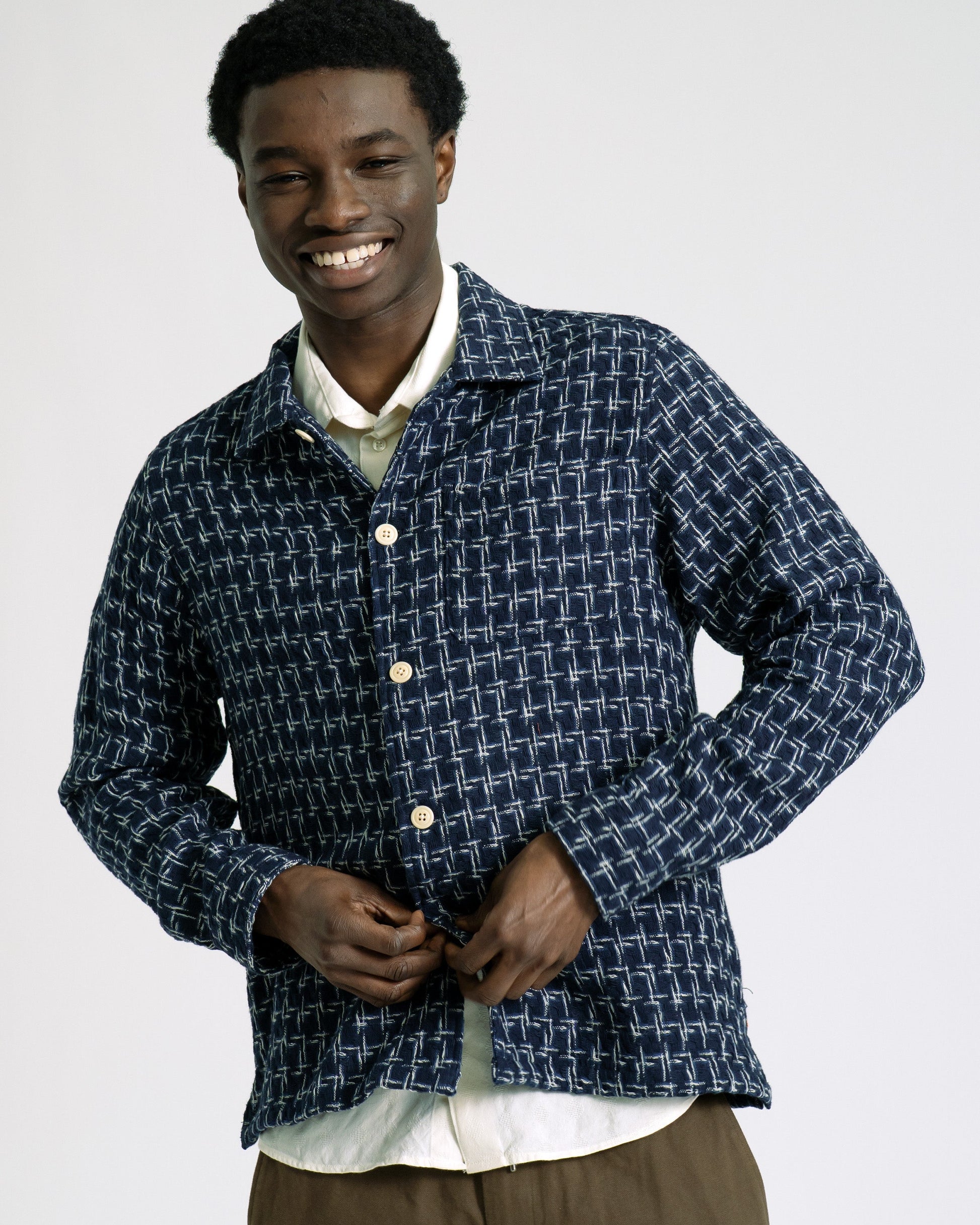 With a few subtle improvements to cut and finish for SS26, the Busey Architect Shirt returns in a heavyweight, loose-woven cotton jacquard that forms a raised grid across the surface. Detailed with a broad spread collar and generous chest pocket, it wears substantial but stays breathable thanks to the open weave.