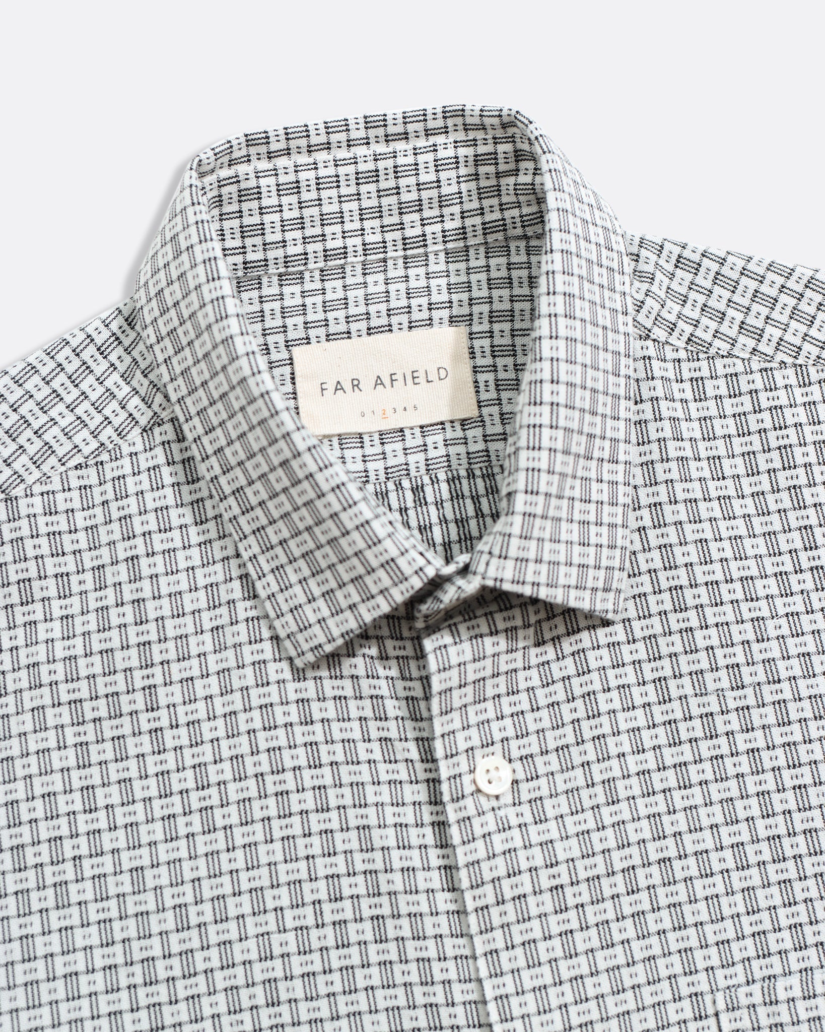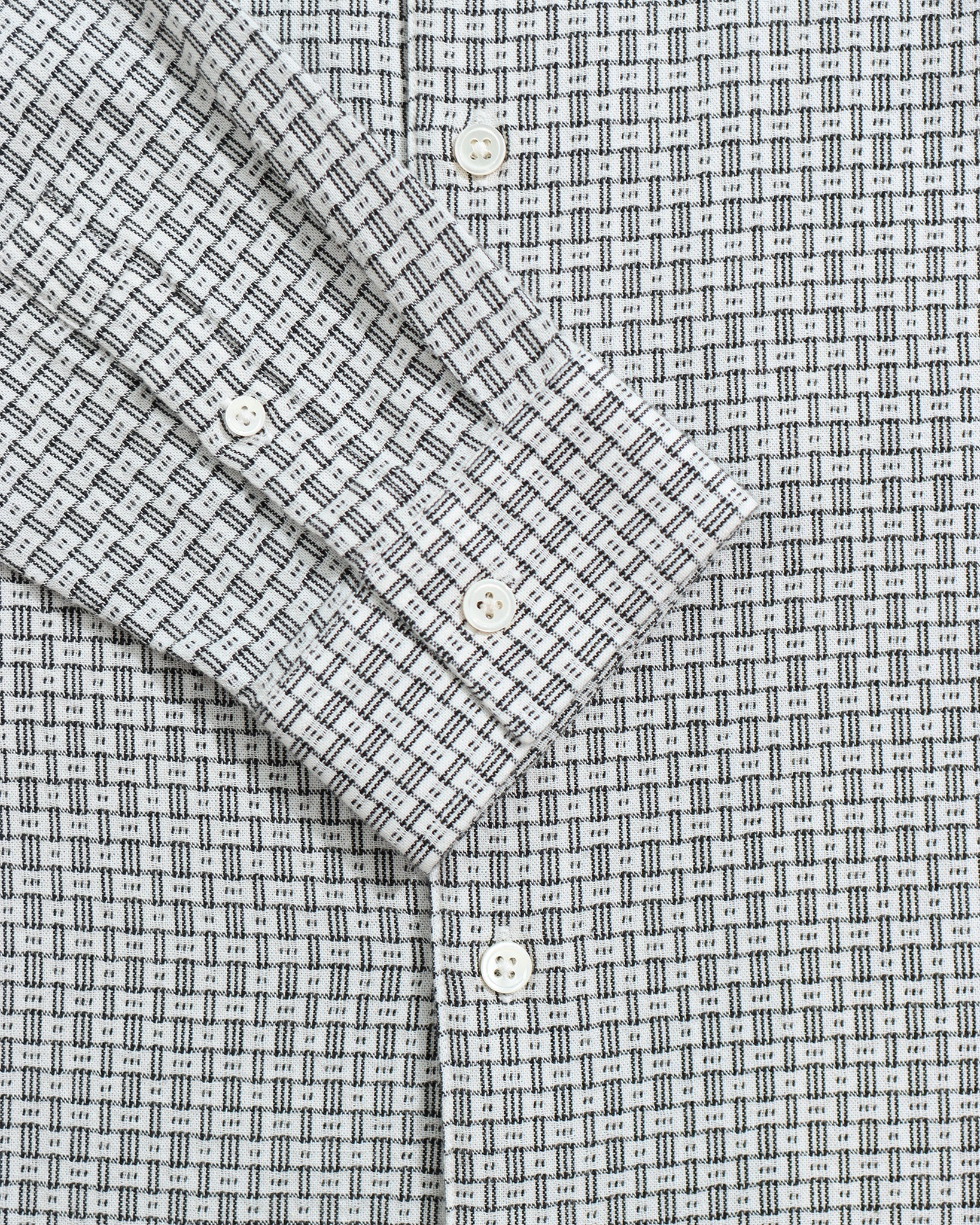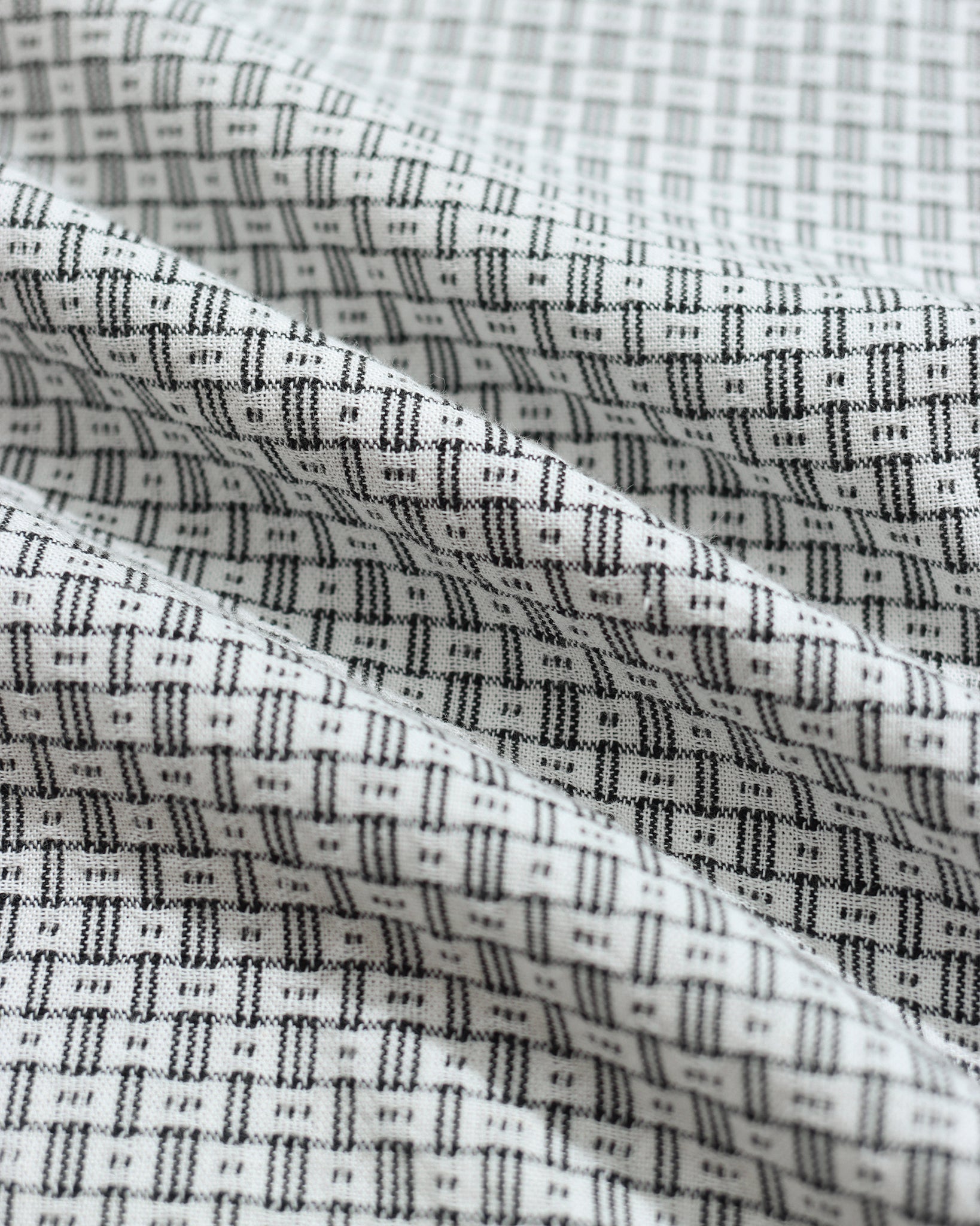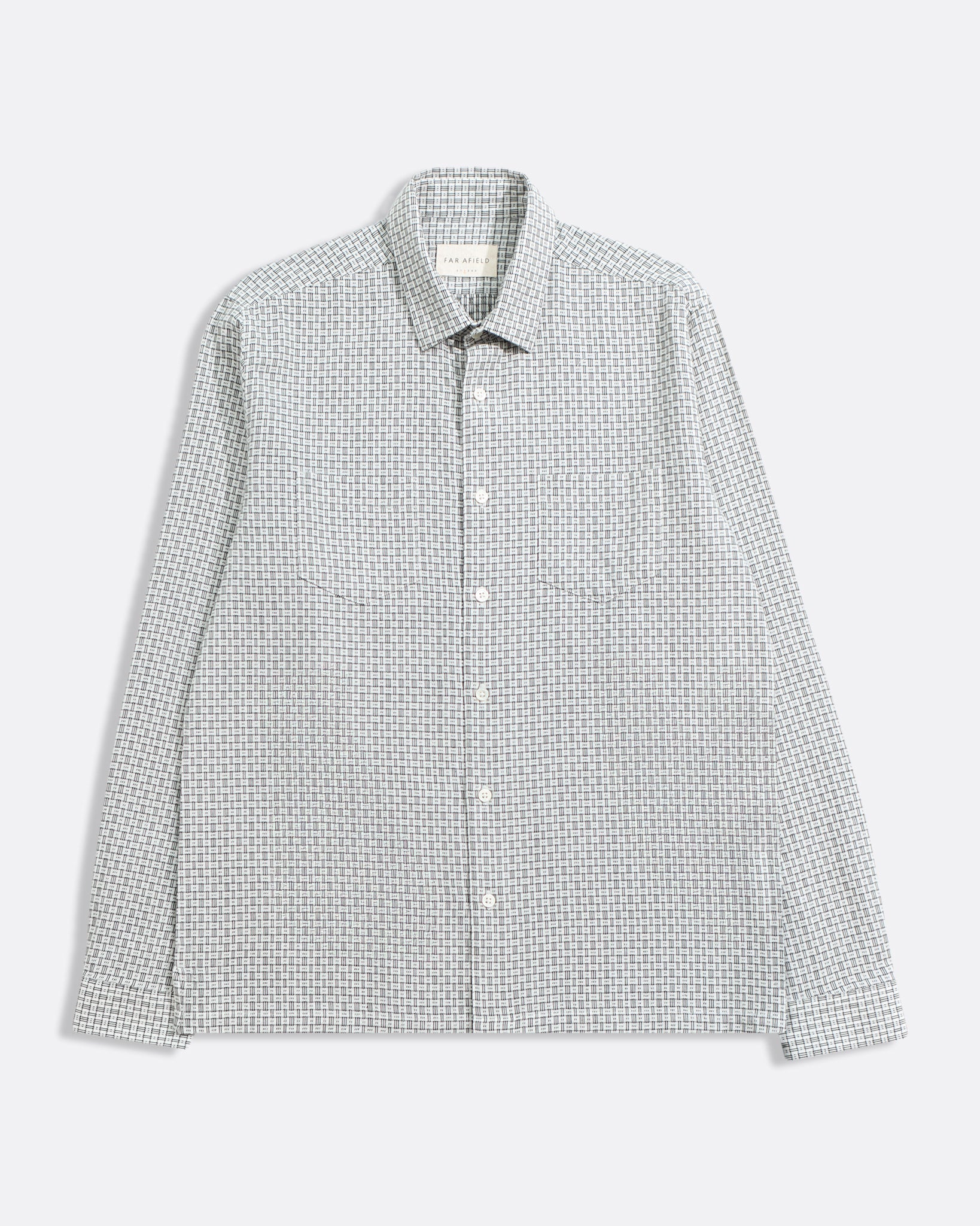 This dobby-woven fabric forms small repeating blocks, a nod to the geometric textiles of the Bauhaus, where pattern and structure were treated as one. Light yet structured, it has a subtle three-dimensional feel that comes alive up close. Cleanly cut with two pattern-matched chest pockets, it lets the fabric take centre stage.